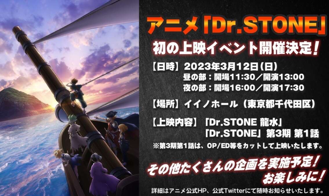 3月12日に「Dr.STONE」 初の上映イベントが開催決定しました!TVスペシャル「Dr.STONE 龍水」に加え、第3期「Dr.STONE NEW WORLD」の第1話を先行上映するそうです。他にも様々な企画を実施予定だそうです。場所はイイノホール(東京都千代田区)で行われるそうです。