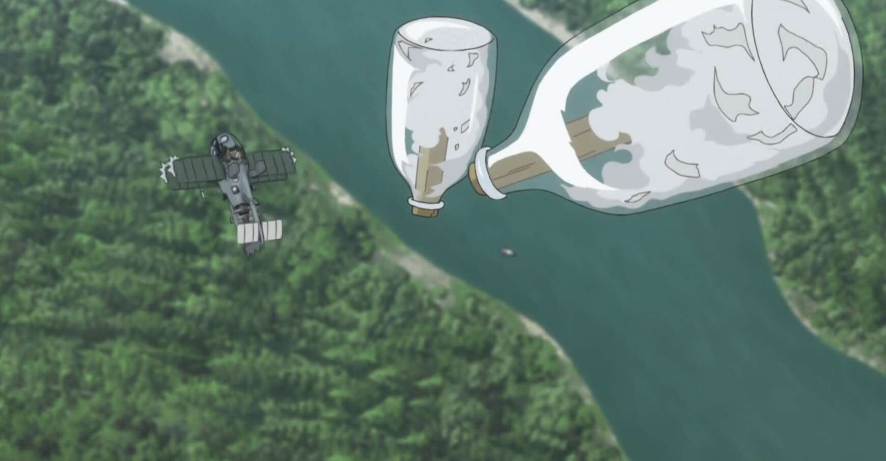龍水の飛行機はトウゴマのひまし油で作ったエンジンオイルのおかげで飛行機のパワーが増しており、スタンリーの背後をロックオンすることに成功します。