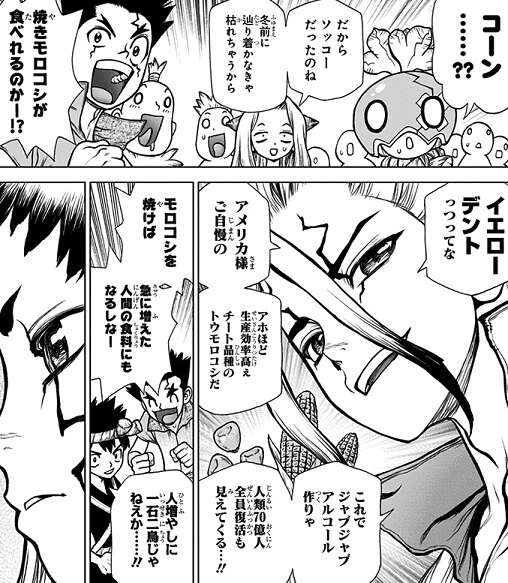 宇宙に行くためのロケットを作る為には、世界中から素材を集める必要があり、千空は世界中の石像を復活させまくって、世界各地に新しい街を造ろうと目指します。数学の街、ゴムの街、アルミの街、コーンの街、超合金の街を造ることを目標にした千空達は、まずはコーンの街を作る為、アメリカ大陸を目指します。