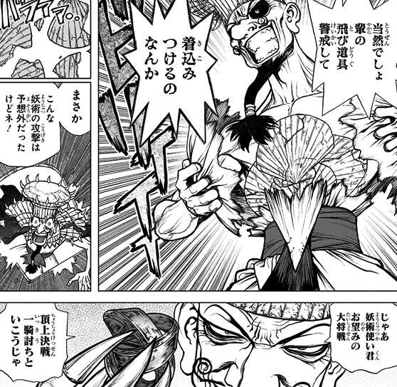 石化装置を囮にして、イバラをラボカーにひかせて千空は石化装置を奪取しかけますが、イバラも用心深く着込みをつけて、ラボカーの体当たりを防いでいました。イバラに石化装置を奪われ頂上決戦の一騎打ちを挑まれますが、正面からの一騎打ちでは勝てないと判断したのか、千空は即逃走して森に逃げ込みます。