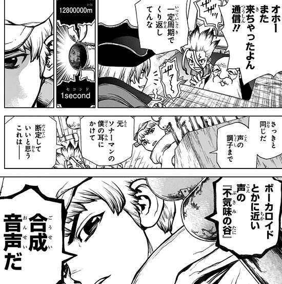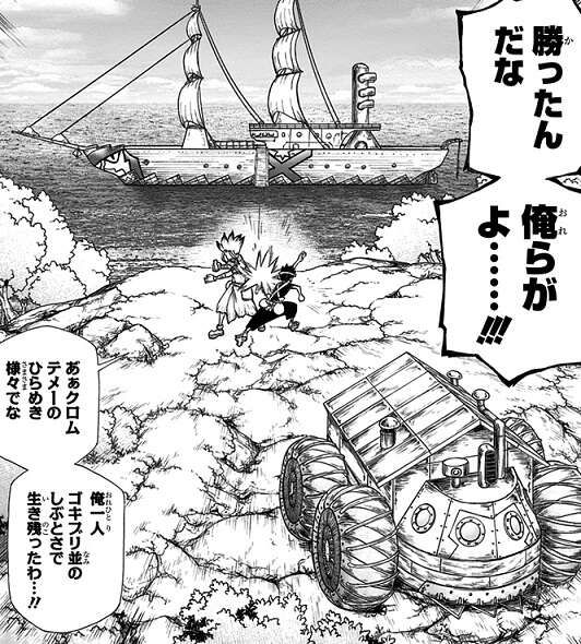 イバラとの一騎打ちに勝ち、イバラを石化させて石化装置を手に入れた千空は、島中の石化された仲間達を復活液で石化解除していきます。そこに本土に残っているルリ達から、千空のもとに通信が入ってきます。あいにく装置の電池残量が少なく会話することが出来ませんが、クロムは安否確認の為だけにルリが連絡してくるのは不自然で、本土で何かあったのでは?と推測します。