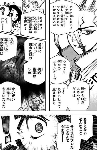 島全部を石化光線が包んだはずなのに千空が石化せず生きている事に、イバラは驚愕します。千空が石化しなかったのは、クロムや龍水達が等間隔に並び片方の手を光の方に伸ばし、反対の方の手で指先から石化が始まった段階で千空に合図を送り、千空に石化光線が届くタイミングを知らせたからでした。これにより千空は復活液を自分にベストのタイミングで使用することが出来、石化光線を浴びた後すぐに復活液で石化を解除することが出来ました。