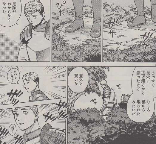 しかし、途中で足跡が分からなってしまい、巣穴から離されたところでライオス達が話しをしていると、兎がライオスに近づいてきます。