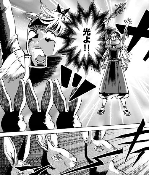 チルチャックに迷宮の兎が群がったところで、マルシルは閃光呪文で迷宮の兎達を気絶させることに成功します。何羽かは逃げたようなので、一網打尽とはいきませんでしたが、センシの確保に成功します。