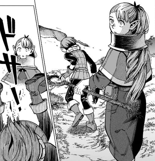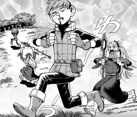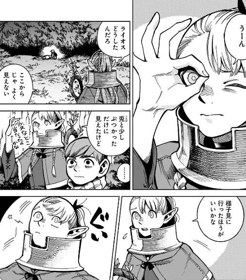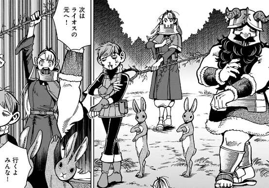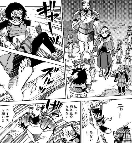 食材として兎を捕まえようとしたライオスは、迷宮の兎に殺られてしまいます。一方、離れた場所で見ているマルシルとチルチャックからは、ライオスが兎とぶつかったようにしか見えません。ただ、チルチャックは不穏な気配を感じているようです。