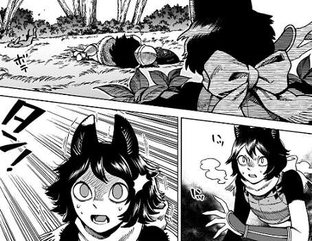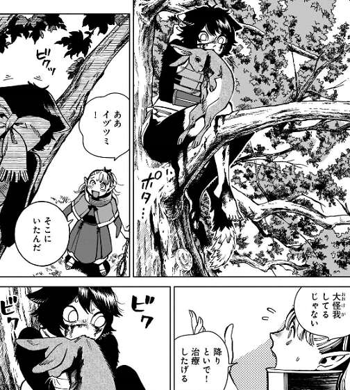 その後、残った迷宮の兎も閃光呪文で片付け、無事ライオスも確保し残るはイヅツミのみです。マルシルがイヅツミを探していると、イヅツミは木の上に避難しています。大怪我をしていて、マルシルが治療すると話しかけますが、イヅツミは何故かマルシルを警戒します。