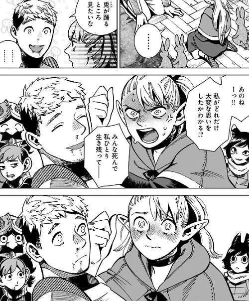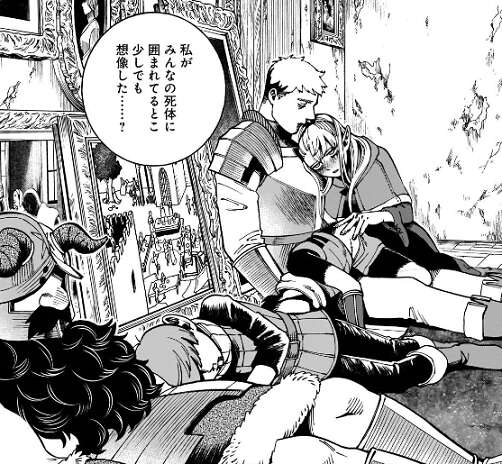 ライオスが鎧を貸した時、全員が死んでもマルシルがなんとかするから大丈夫、とライオスが言っていた事を、それもう作戦じゃないから!と怒った後、その後のことを、みんなの死体に囲まれているとこ少しでも想像した……?と呟きます。