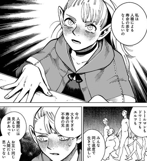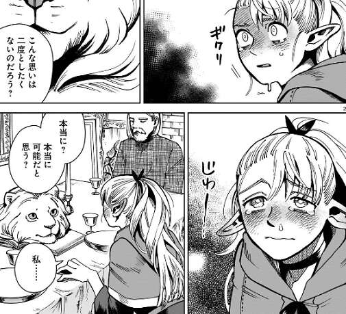 そして、有翼の獅子との会話でマルシルの願いが判明しますが、人種の寿命の差をなくすというかなり難易度が高そうな願いです。おそらく6巻、42話でマルシルが見た悪夢と、昔の体験(親しいものが自分より先に死ぬという不安)が元になって、このように願ったのだと思いますが、この願いは色々複雑ですね。トールマンの寿命をエルフに合わせるのか、エルフの寿命をトールマンに合わせるのか、等同じ速度で生きるといっても誰に合わせるのか、みんながそれで納得するのか、色々問題は多そうです。有翼の獅子はマルシルの願いを叶える事が出来そうなニュアンスで話していましたが、有翼の獅子の狙いはそれ以外にもありそうで今後の展開が気になります。