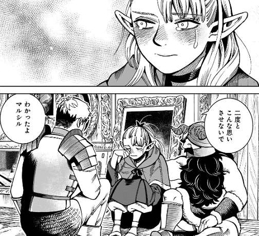 その後も新たに出てきた迷宮の兎を何とか対処しつつ、やっと家まで戻ってきます。ライオス達全員を家の中に入れてホッとしたのか、緊張の糸が切れたマルシルは泣き出してしまいます。そしてライオスの治療をしつつ、死んでしまったライオスに悪態をつき始めます。