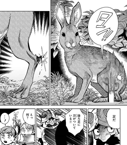 一方、殺られたライオスに近づくセンシに、迷宮の兎はスタンピングをしながら様子を伺います。その後ろ脚には刃が付いていて、センシがその事をマルシル達に大声で伝えようとしますが、それと同時に迷宮の兎がセンシにも襲い掛かります。