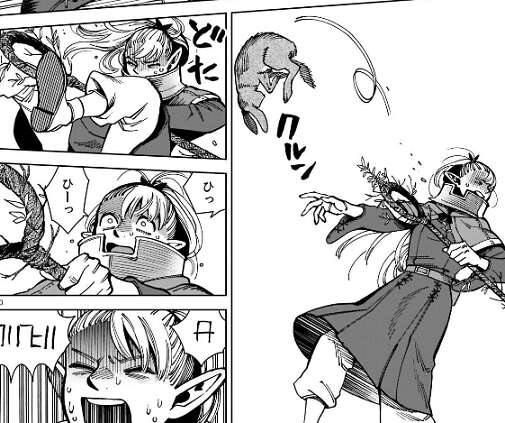 さらに迷宮の兎は、マルシルの首も切り裂こうとしますが、前回ライオスが貸してくれた鎧のおかげで、なんとか迷宮の兎の刃の攻撃を防げました。驚いたマルシルは条件反射的に、攻撃魔法で迷宮の兎を攻撃しますが、威力がいつもと段違いです。