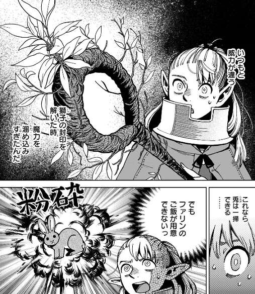 獅子の封印を解いた時に、魔力を溜め込み過ぎたようですが、これで兎を一掃できます。しかし、ファリンのご飯の食材として兎を捕まえたかったのに、これではファリンのご飯が用意できません。他の使えそうな魔法がないか考えますが、そもそもマルシル一人で迷宮の兎の群れと戦えば大怪我しそうです。