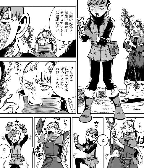 しかたなく、マルシルは魔術でチルチャックの身体を動かすことにします。死体を魔術で動かすネクロマンシーは犯罪と分かっていますが、今は仕方ないとマルシルは自分に言い聞かせます。