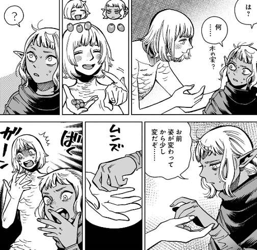 ミスルンからデルガルは既に死んでいると言われ、必死にその事を否定するシスルですが、そんなシスルを見たファリンはシスルの為に木の実をあげようとします。この辺は、ファリンと炎竜の魂が混ざっているのか、主(あるじ)を心配する炎竜と、マルシルの時の様に木の実を大事な人と一緒に食べたいファリンの性格が出ているようです。結局、シスルはファリンの意図がよく分からず、木の実を全部食べてしまい、ファリンはお腹を空かせてがっかりしています。