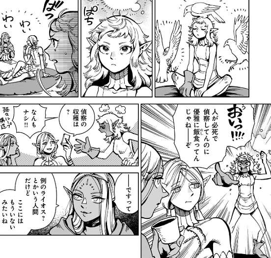 場面変わって、第6階層のカブルーとカナリア隊です。ライオス達をカナリア隊の鳥を使って探していますが、見つかりません。ライオス達は既に、扉を開いて先に進んでしまっています。ここでもシスルの使い魔が、カナリア隊を監視しています。