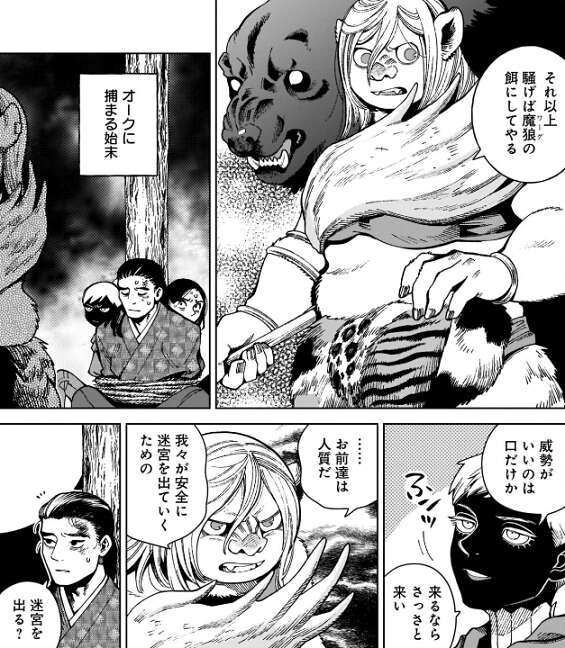 地下1階から大穴に落ちてしまったシュローとリンシャ、エルフのフラメラは、道に迷って地上になかなか帰れず、その上オークに捕まってしまいます。ゾン族長の妹・リドに捕まっているので、第5階層まで落ちてしまったようです。エルフのフラメラはリドを挑発しますが、リドは迷宮の様子がおかしいとシュロー達を人質に迷宮を出るつもりのようです。
