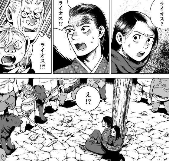第5階層では、オーク達と捕らわれたシュロー達が言いあいをしていた所に、パッタドルから連絡が入り、ライオスが迷宮の主を倒したという事を知ります。