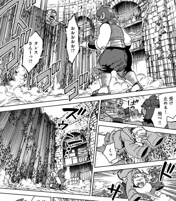 ナマリは大穴に落ちたシュローを迎えに行くと言い、タンスが言う迷宮内の違和感にも気を付けると言うと、下層に行こうとしますが、急に迷宮の地面がせり上がっていきます。地面の上にいたタンスも一緒に上がっていきますが、タンスに受け止めてもらうことで何とか飛び降り、元の場所に戻れました。