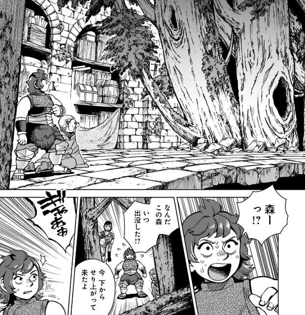 第1階層では、ナマリとタンスが迷宮内の変化について話していたところ、迷宮の地形が変わり、迷宮の階層が一つになり、第1階層にいた冒険者達が魔物達に混乱する様子が描かれています。