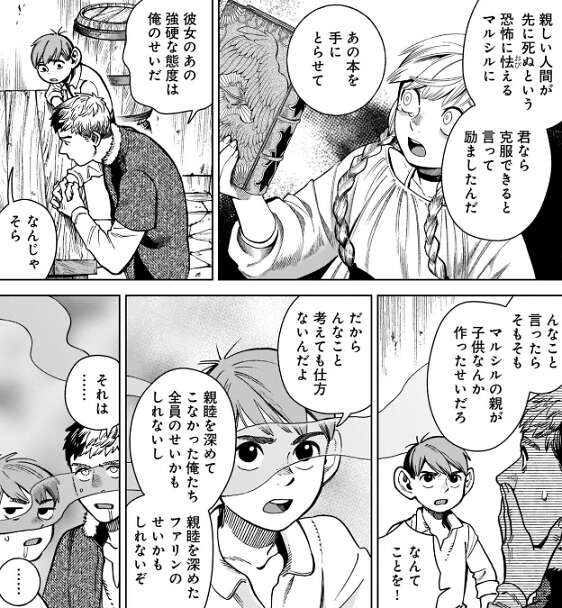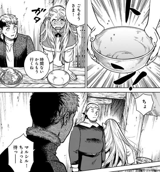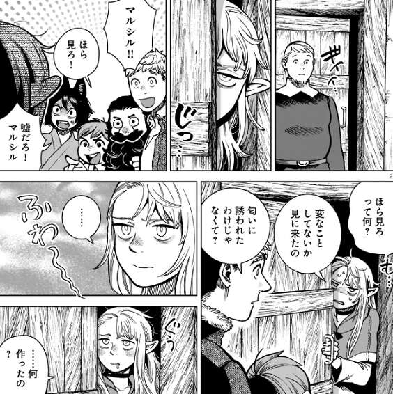 第6巻 第42話「夢魔(ナイトメア)」での話ですが、ライオスはマルシルが夢魔に襲われていた時、夢の中で親しい人間が先に死ぬという恐怖に怯えていたマルシルに、君なら克服できると言って励ましました。ライオスは、マルシルが強硬な態度をするのは自分が焚きつけたからだ、と責任を感じますが、チルチャックは考えても仕方がない、マルシルの親のせいかもしれないし、全員のせいかもしれない、ファリンのせいかもしれないぞ、とライオスに言います。その時、センシが作っていたマルシルの地元の郷土料理が完成し、その匂いにつられてライオスとチルチャックは会話を進められなくなります。