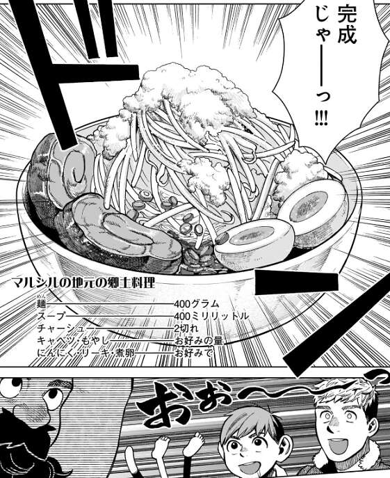 センシはマルシルの父親の話を元にパスタ料理を作りますが、どう見てもラーメンです。イヅツミが絶対違うだろう、今までの思い出でそんな地方色一切なかったぞ、とライオス達に抗議しますが、ライオスもチルチャックもセンシもイヅツミが言っている事が理解できないようです。