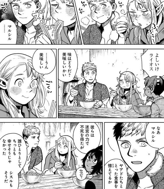 マルシルはパスタ料理(ラーメン?)を一心不乱に食べ続けますが、その間にライオスはマルシルを説得しようとします。迷宮の力はよくないものなのかもしれない、とライオスはマルシルを説得しようとしますが、先にマルシルは料理を完食してしまいます。