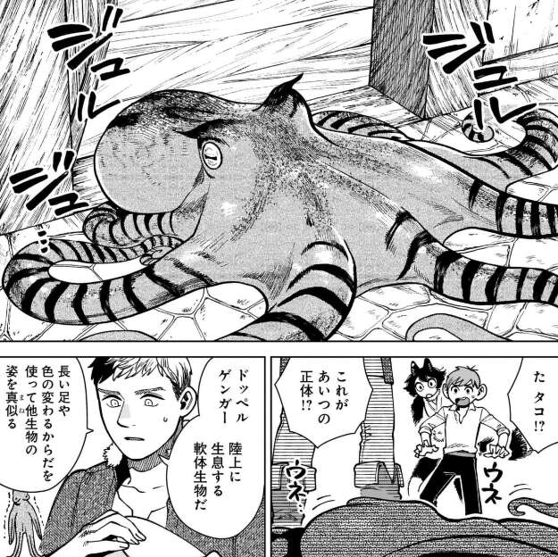どんぶりに映った自分を見ていたマルシルの父親は、姿がどんどん変わっていきタコになってしまいます。ドッペルゲンガーの正体は陸上に生息する軟体生物で、長い脚や色の変わるからだを使って他生物の姿を真似ていました。鏡を見せるとそこへ映った自分の姿を真似ようとして元の姿に戻ってしまうんだ、とライオスは言った後、全員でマルシルを追いかけます。廊下を走っている途中、廊下にあった窓からマルシルと翼獅子が一緒に歩いているのが見えます。