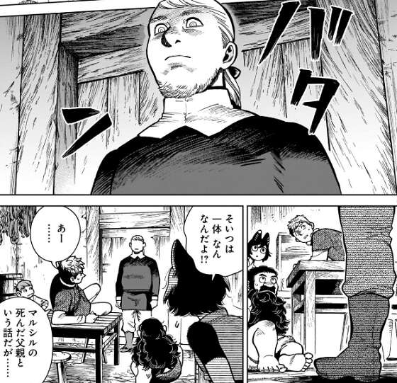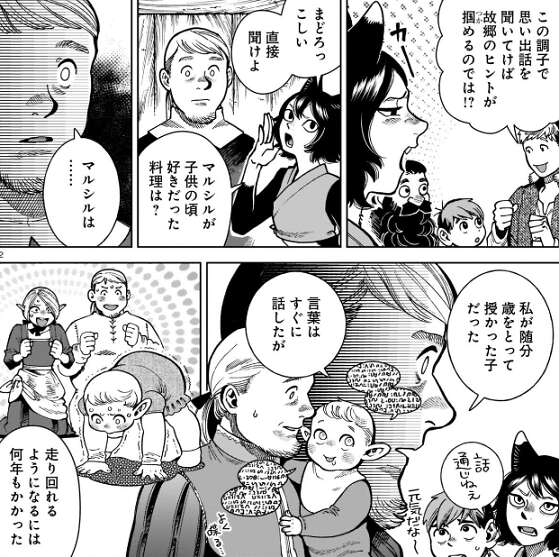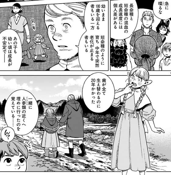 すると突然マルシルの父親が、マルシルが幼い頃どんなだったかをライオス達に喋り始めます。マルシルは長命種と短命種の混血で、幼い頃は成長が不安定だったようで歯が全て生え変わるのに20年かかったそうです。