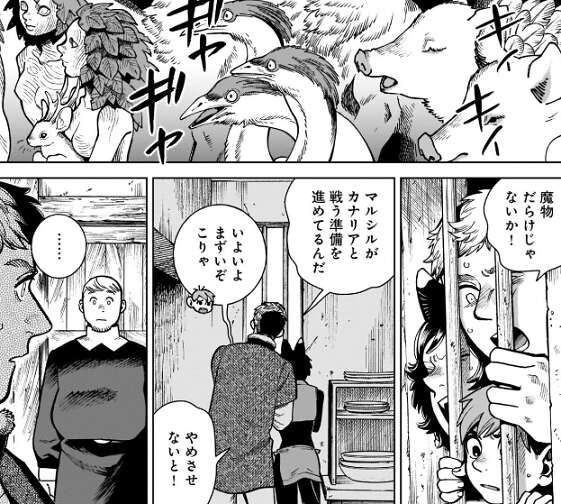 何とかマルシルをやめさせないと!と、ライオス達は強引に部屋を脱出しようとしますが、マルシルの父親は相当力が強く、簡単に部屋の中に押し戻されてしまいます。マルシルの父親には力では敵わないと考えたセンシは、部屋から脱出するのではなく、マルシルを誘い出してみてはどうだ?と、ライオスに提案します。前回の食事から随分経つので、そろそろ腹も空くだろうと、特別で魅力的なメニュー、猫にまたたびのような食事を作ってマルシルの気を引こうと言います。ライオス達はマルシルの大好物をあげますが、どれもダンジョンに潜っている最中に食べた魔物食ばかりで、マルシルの好きそうなものはありません。