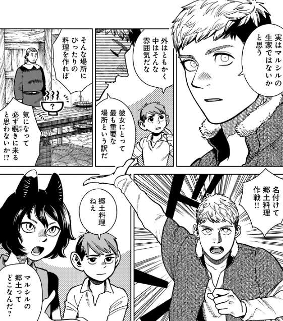 すると突然ライオスが、……そういえば、ここはどこなんだろう、と言い出します。ここはマルシルが新しく作った空間にしては生活感があり、きっとモデルがあるんだ、とライオスは推測します。そして、実はマルシルの生家ではないかと思う、とライオスは言い、マルシルの生家にぴったりの料理を作れば、気になって必ず覗きに来ると思わないか!?と、ライオスはチルチャック達に言います。名付けて郷土料理作戦!!と、ライオスは命名しますが、マルシルの郷土を誰も知らずそこで話は止まってしまいます。
