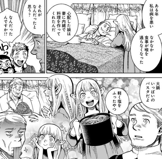 マルシルの父親はある年、病を患いなかなか食事が食べれない状態が続きますが、心配したマルシルが母親に内緒で、父親に料理を作ったそうです。マルシルは大鍋いっぱいのパスタを父親の為に作ったそうで、マルシルの父親はパスタを死ぬ気で間食したそうです。それを聞き、センシは麺を打ってパスタを作る事にします。さらにマルシルの父親から、マルシルの母親の作るローストポークが大好きだったという事を聞き出します。