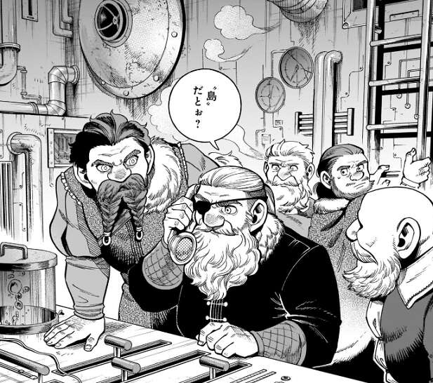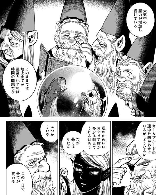 マルシルが地上に出ようとしたことで、迷宮内だけでなく世界に異変が現れ始めます。エルフ、ドワーフ、ノームの地位が高そうな?人達が、連絡を取って話し合いをしていますが、長いことは持たなそうです。ノームのおじいさんが言っている通り、地上全てが迷宮と化してしまうのでしょうか?最後の方で父親と子供が話している後ろに、カーカブルードのドワーフの軍隊と思われる集団がいますが、少しは島の混乱を収拾できるでしょうか?