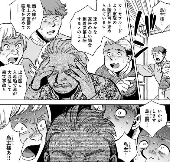 場面は島に変わり、迷宮の形が変わったことで地上部分でも変化が現れます。迷宮から生じた地割れがどんどん広がっていき、島を飲み込む勢いで広がっていきます。さらに島主の所に、カーカブルードの軍隊が上陸許可を求めてきていて、速やかな返答がない場合到着次第、上陸すると言ってきます。他にも商人達が地上の警備を求めたり、港で大混乱が起きるなど、島主の所に連絡が多数来ますが、島主は、もう好きにしてくれー、と叫ぶだけで島主に問題は解決できそうにありません。