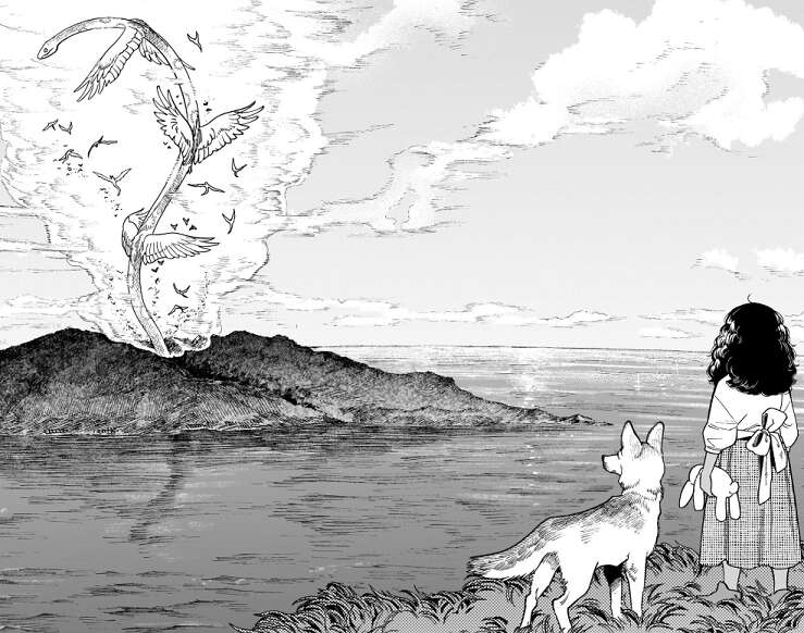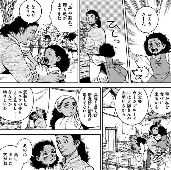 地上で眺めていた子供は父親の所に戻ると、“島”が割れて煙と竜が出てきた、と泣きつきながら見たことを父親に教えます。しかし父親は子供の言う事を信じず、笑いながら大丈夫と答えます。カーカブルードには兵隊が大勢いるから大丈夫、と父親は言いますが、島にあいた穴がおおきなお口みたいだった、と子供は不安そうに話します。