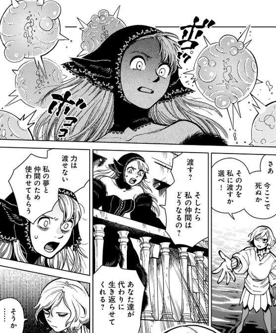 それでもミスルンはマルシルに、お前の浅はかな翼は悪魔にとっていい餌だ、と言い続けると、マルシルは激怒しミスルンをさらに攻撃しようとします。ミスルンはマルシルに悪魔の力を渡すように言いますが、マルシルは、力は渡せない、私の夢と仲間のために使う、と言うと、ミスルンは、であれば死ね!!と、言い転移術を使ってマルシルに近づき、マルシルを殺そうとします。