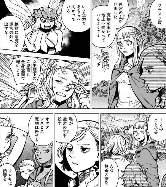 パッタドルは、広い迷宮のどこを探せばいいのか……、と戸惑いますが、ミスルンは地上を目指しているのだから必ずここを通ると言い、建物の方を指さします。すると、そこには地上を目指す魔物の群れと、マルシルがいました。魔物の群れと迷宮の主がいたことをパッタドルはフラメラに伝えると、全力でそちらに向かっているから、絶対に悪魔を迷宮の外に出すな!女王陛下のご恩寵に全身全霊で報いよ!!と、連絡用の妖精を通して叫びます。結局、無茶苦茶な指令ですが、カナリア隊全員で魔物の群れと迷宮の主を止めることになります。