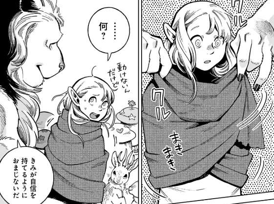 一方、地上を目指すマルシルですが、この先にカナリア隊がいると予想し、カナリア隊には拘束されたり、腹を刺されたりと怖い思いでしかないので、マルシルは怯えてしまっています。すると、マルシルの怯えた様子を見た翼獅子は、布をマルシルに巻くとマルシルが自信を持てるおまじないをかけると言い出します。