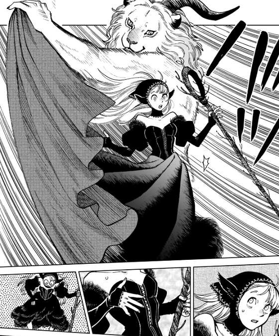 今回は迷宮の主となったマルシルと、カナリア隊との戦闘がメインです。マルシルはカナリア隊に怯えて戦闘を嫌がりますが、翼獅子は自信を持てるおまじないをマルシルにかけます。実際は勇気が出たのではなく、翼獅子の暗示か、もしくはマルシルの恐怖の感情を翼獅子食べたようで、マルシルが着た勇気の出るドレスはあまり意味のないものでしょう。