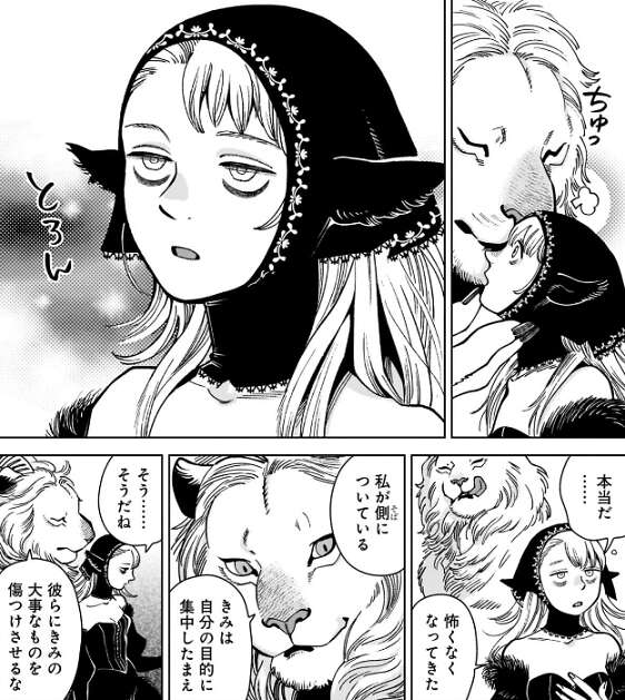 突然、衣服がドレスに変わり驚くマルシルですが、翼獅子は勇気の出るドレスだと言います。恐怖が薄れていくだろう、と翼獅子は言うと、マルシルのほほに、ちゅっ、と口づけをします。すると、マルシルの表情がとろんとしたものに変わり、マルシルは怖いという感情がなくなってきます。翼獅子が感情を食べた?ようで(もしくは翼獅子の暗示?)、翼獅子はマルシルに自分の目的に集中するように言うと、マルシルはファリンやライオス達を守らなきゃ、と切羽詰まった表情に変わります。