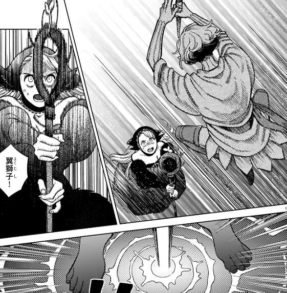 ミスルンはマルシルの背後に転移し、マルシルをユニコーンの角で刺そうとします。しかし、あと少しという所で翼獅子の翼でユニコーンの角を止められてしまいます。