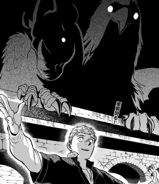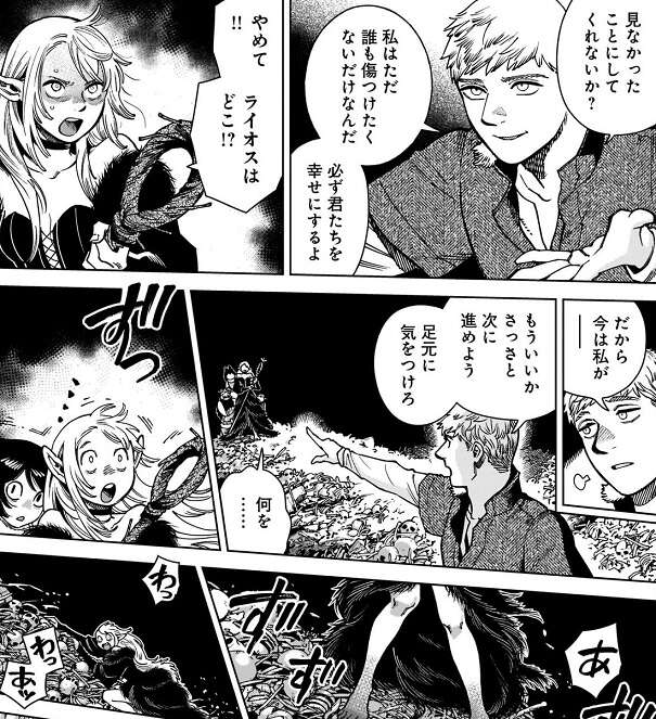 前回、ライオスの体に入った翼獅子は、マルシル達の前で首を繋げなおしてみせました。その異様な様子にマルシル達はドン引きし、後ずさりしますが、ライオスの体に入った翼獅子は、ライオスだよ、と言いごまかそうとします。どうやら、ライオスの体は翼獅子に完全に乗っ取られてしまったようです。