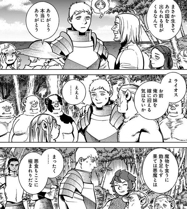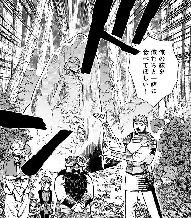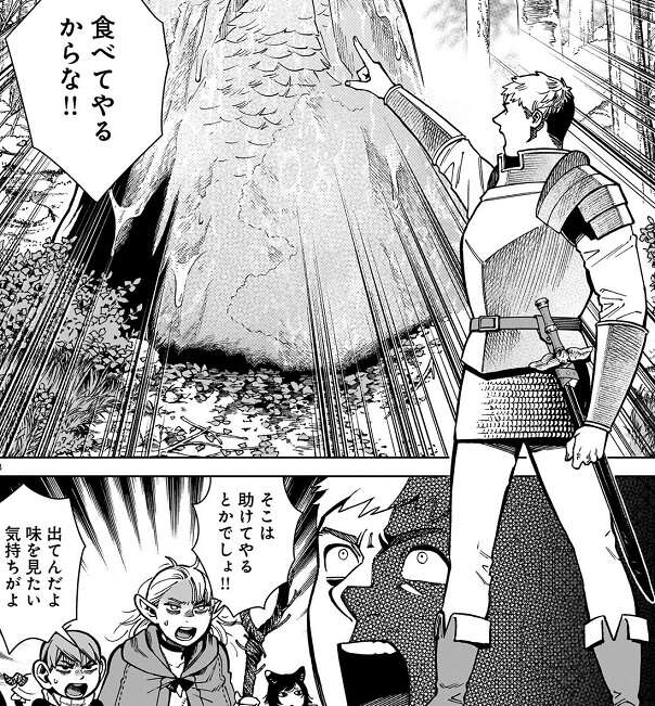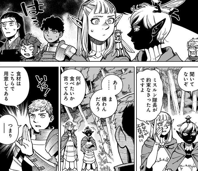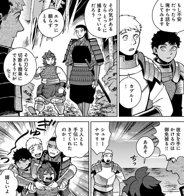 ライオスはミスルン隊長の協力も仰ぎたいと言い、ミスルンの転移術があればファリンの移動や切断が楽になる、とマルシルに言います。マルシルが、あんまり話が通じそうにない人だった、と言うと、カブルーはそんな事はないと思う、と言ってライオス達の方に歩いてきます。さらにナマリとシュローもライオス達の方に歩いてきて、エルフにその気があればとっくに捕まっているだろう、とライオスに言います。ナマリはシュローの刀があれば切断も簡単にできそう、と言いますが、シュローはファリンを手にかけるのは御免被る、と拒否します。しかし、三人ともライオスの調理に協力するようで、ライオスは大喜びします。