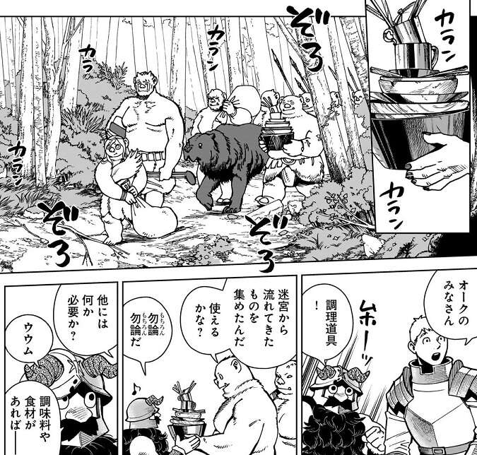 さらにオークの一団もライオスの調理に協力すると言い、調理器具を集めてきてセンシに渡します。センシは調味料や食材もあれば欲しいと言うと、沢山の荷物がセンシの場所へと投げ込まれます。