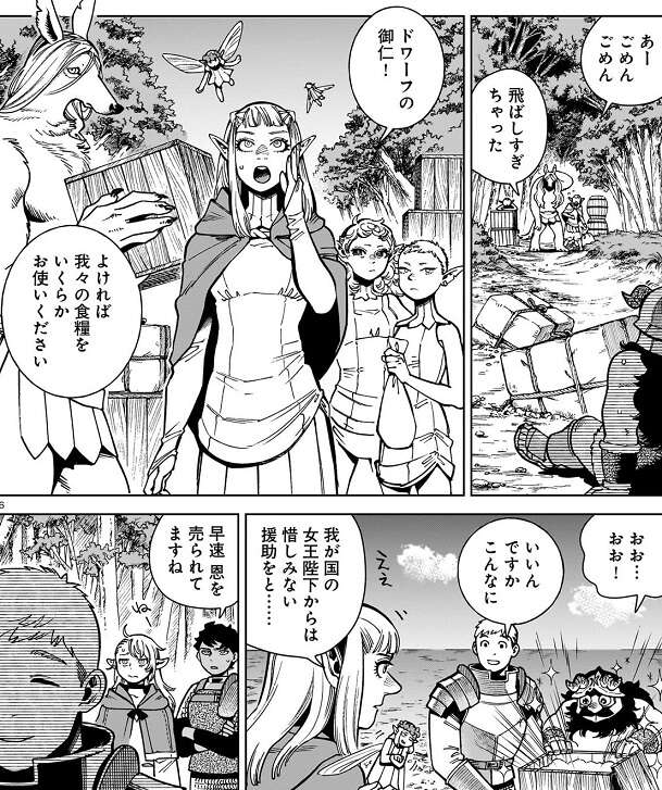 沢山の荷物を投げたのはカナリア隊のメンバーで、荷物の中身はカナリア隊の食糧のようです。エルフの国の女王陛下からは惜しみない援助をするように言われている、とパッタドルから言われ、カナリア隊もライオスの調理に協力する決定をしたようです。しかし、マルシルやカブルーは、カナリア隊が早速 恩を売っている、と少し警戒しています。