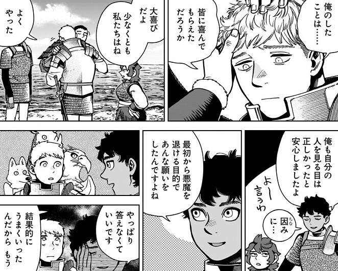 ナマリ達はライオスに近づいていき、世界を救ってくれたことに感謝します。ライオスは未だにうだうだ言っていますが、ナマリは、大喜びだよ、少なくとも私たちはね、とライオスを褒めます。カブルーはライオスに、最初から悪魔を退ける目的であんな願いをしたんですよね、と聞きますが、ライオスが微妙な反応をしたので、それ以上は答えなくていいとライオスに言います。