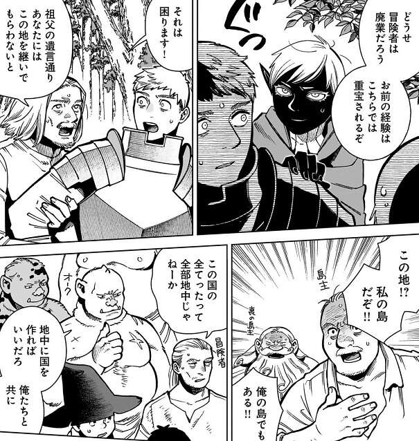 さらにカナリア隊からはエルフの国に誘われますが、ヤアドには祖父の遺言通り、この地を継いでもらいたい、とお願いされます。しかし、島主や裏の島主には、この島は俺の島だ、と主張され、皆が思い思いにしゃべるので、場が混乱していきます。