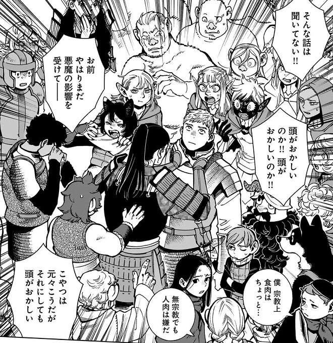頭がおかしいのか!!と、フラメラは怒り、ライオスがまだ悪魔の影響を受けているのでは?と、疑います。しかしライオスは、レッドドラゴンや狂乱の魔術師、翼獅子と対峙したのはあくまで“ついで”で、全部妹を取り戻すためにやったことだ、と言います。竜と合成してしまったファリンを元に戻すには、竜部分を消化した後、蘇生するのが最適解だと考えた、とライオスは自分の考えを皆に伝えます。そして、スープの一杯だけでも、調理を手伝うだけでもいいので、気が向いたら力を貸して欲しいと伝えます。