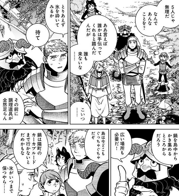 ライオス達は勝手に作り始めますが、案の定他の皆は戸惑ってしまい、どうするか悩みだします。他の皆が悩んでいる間にも、ライオスは調理に取り掛かろうとしますが、センシは調理道具が全然足りない、と言います。さらにファリンの氷がいつまで保つか分からないので、マルシルはファリンの保存方法も考えないと、と言います。