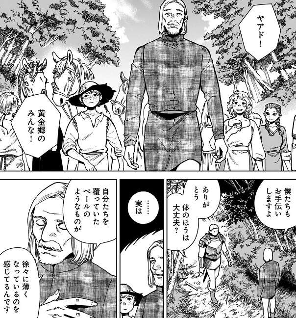 ライオスが、そもそも迷宮のルールがいつまで保つかわからない、と悩んでいると、ヤアドが、僕たちが生きている間は少なくとも大丈夫ですよ、とライオスに話しかけてきます。ヤアドや黄金郷の住人は、ライオスの調理を手伝うと言い、ライオス達と一緒に作業を始めます。ライオスが、体のほうは大丈夫?と、聞くと、ヤアドは自分たちを覆っていたベールのようなものが、徐々に薄くなっているのを感じる、と答えます。このベールがなくなった時が、ヤアドや黄金郷の住人の命が尽きる時のようですが、まだまだ時間は先のようで、今のうちにライオスに恩返しがしたいと言います。
