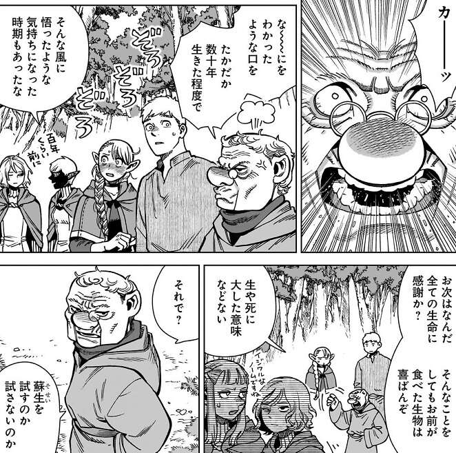 そんな話をマルシルがしていると、タンスがやってきて、たかだが数十年生きた程度で何を分かったような口を、と説教をします。そんなことをしてもお前が食べた生物は喜ばない、生や死に大した意味などない、とタンスはマルシルとライオスに言います。そしてタンスは蘇生を試すのかとライオスに質問し、カナリア隊のミスルン、フラメラは蘇生を手伝うとライオスに申し出ます。